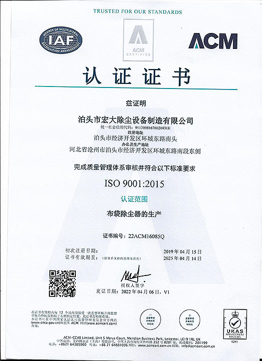 ISO9001認證證書-ISO 9001認證證書-宏大除塵設備